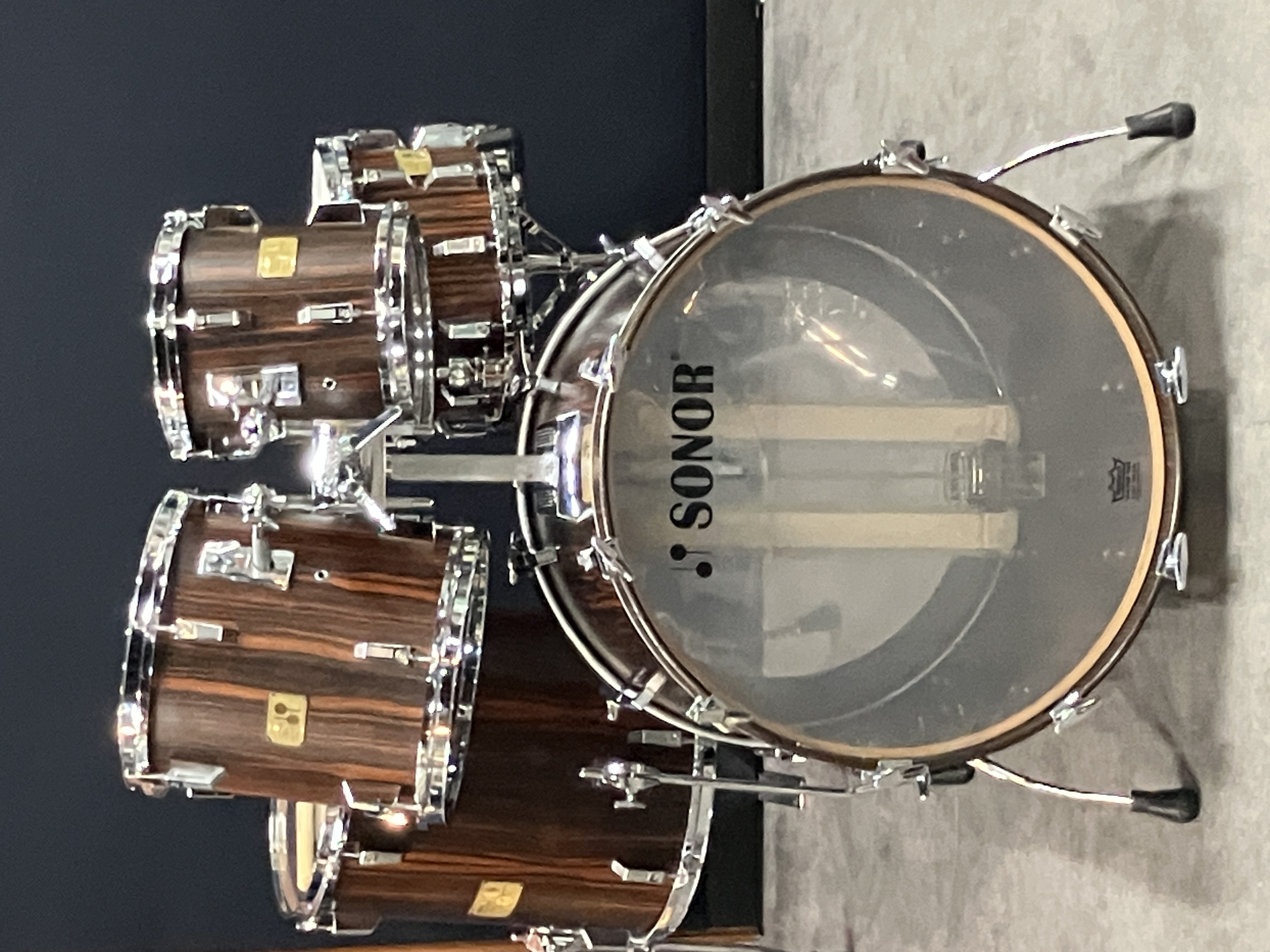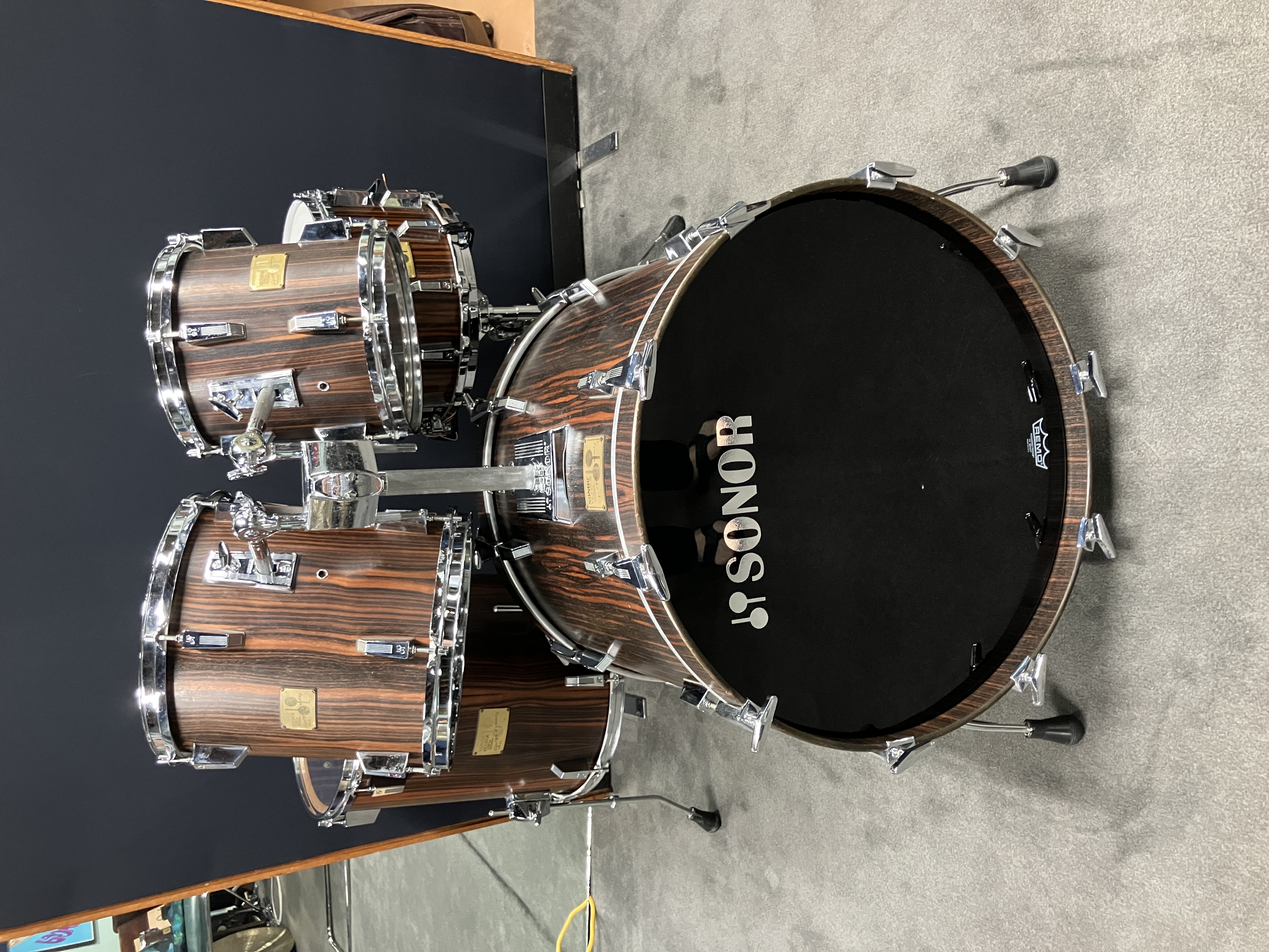 The modified 14x8 matching snare is available first to any interested parties and not sold separately until the rest of the set sells. The mods to the snare are the replacement of original parallel strainer (extra holes present) with the wonderful Sonor Dual Glide system, both sides. Actually, I need to double check if there were any extra holes drilled for the Dual Glide because I am not sure. Original hoops with bottom gates 'trimmed' off. Chrome is approximately a 6.5/10