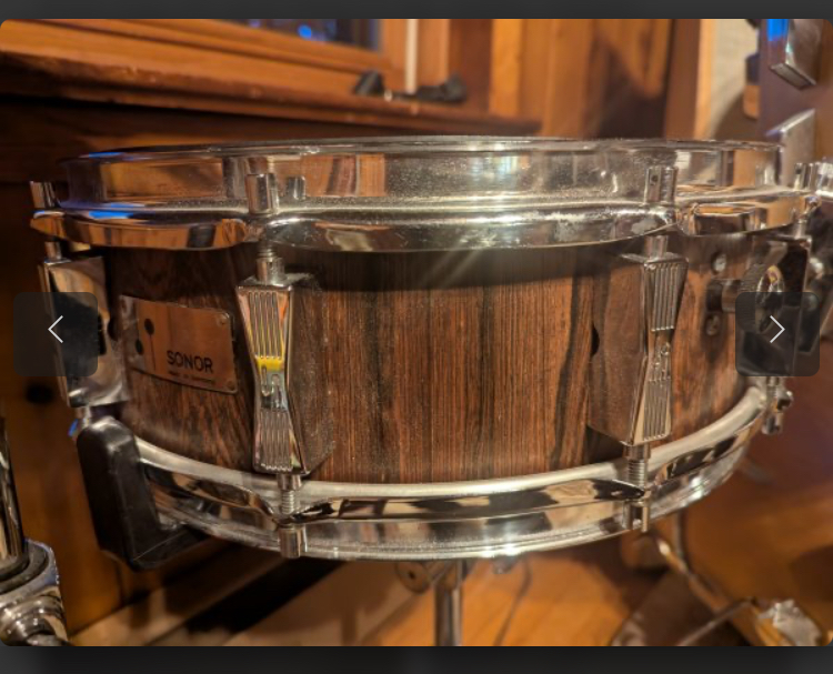 From the owner - “Found a 5x14 rosewood in/out champion snare on tour in Europe in 2014 and that got me excited about Sonor. Rumor mill is that some rosewood champions have a slightly thinner shell. I have a rosewood champion snare that is super thin, but I've never measured it more side by side of it with a regular production champion. 5x14 rosewood in/out Sonor Champion (same 6 ply shell as the original rosewood teardrops with 30 degree edges) it's a little thinner than regular teardrops. And neither here nor there but no Sonor nerd I've talked to has ever seen or heard of another rosewood Champion snare, oddly) and it's one of my favorite wood snares I've ever played.