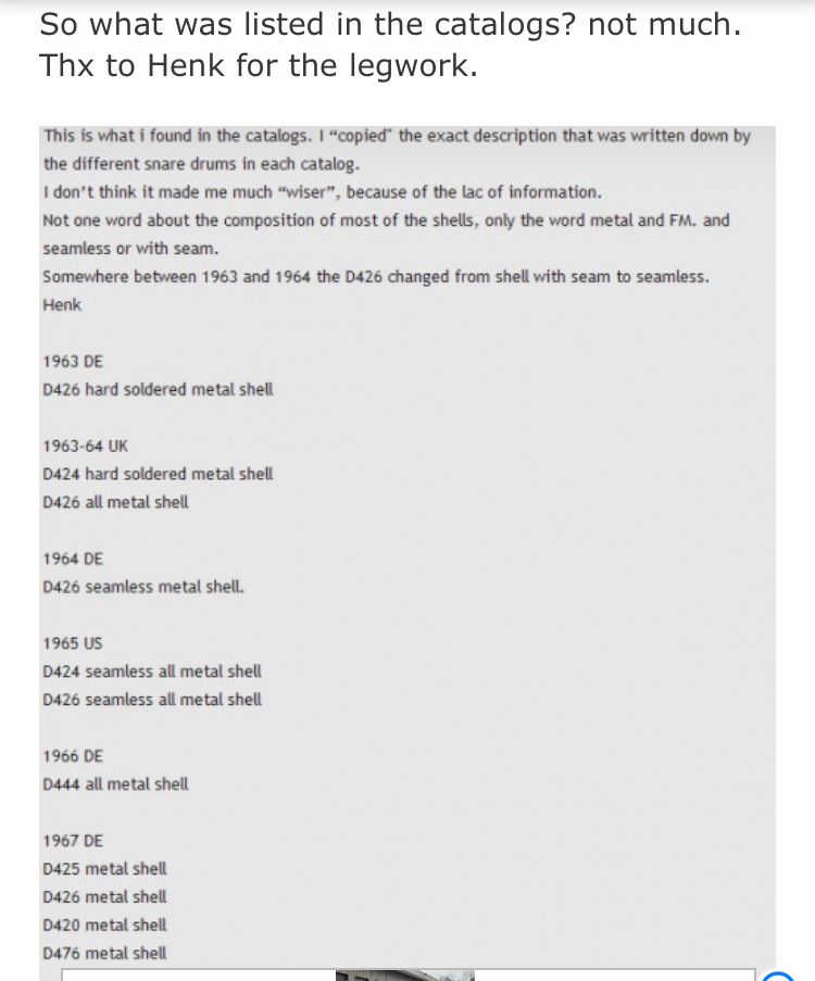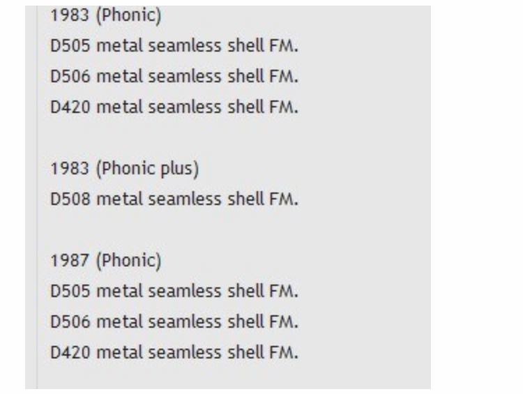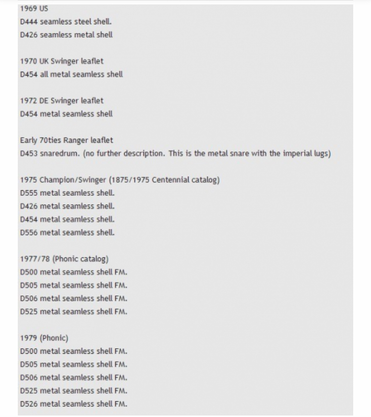 Model, bearing edge rolled or 45, seamless or welded, magnetic or non, FM or metal. This list does not include every model and was done by an international group. Sonor had a habit of changing things under the hood but still using the same model number. So some users had a different variant of a snare and if you have one and its different then whats listed, thats fine; its just old Sonor.