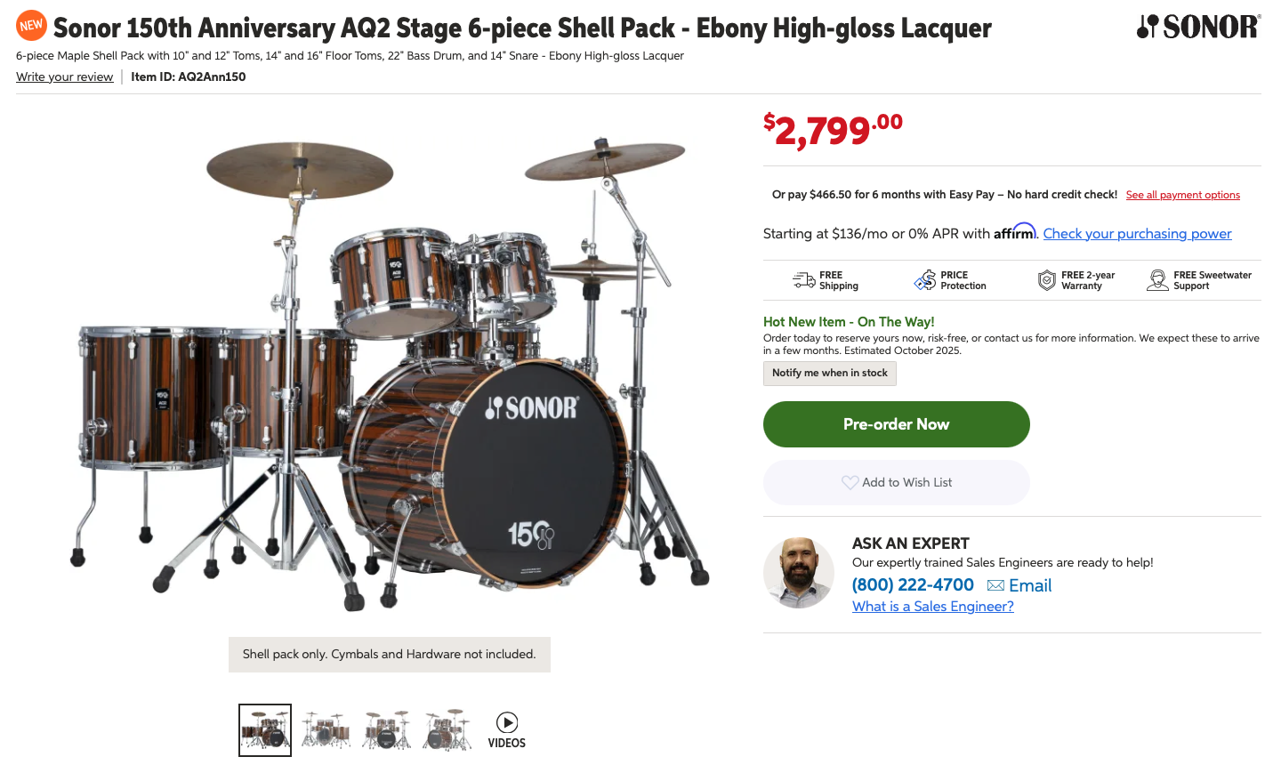 Sweetwater: Sonor 150th Anniversary AQ2 Stage 6-piece Shell Pack - Top seller... going fast!
